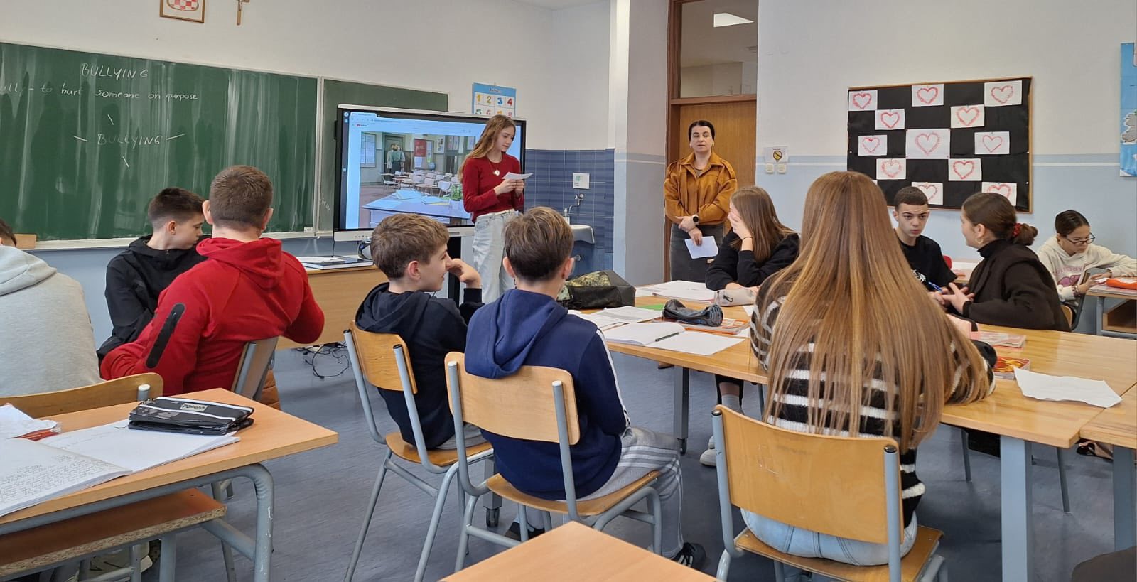 Učenici 8.b razreda i nastavnica Marija Šutalo na satu engleskog jezika obradili su temu “Bullying”, a ujedno su obilježili i Dan sigurnijeg interneta. Kroz igru “Wrinkled Heart” pokazali su koliko je važno razvijati empatiju. Empatija je ključni alat u smanjenju nasilja jer razumijevanje tuđih osjećaja, strahova i potreba izravno umanjuje frustracije, sukobe i mržnju.