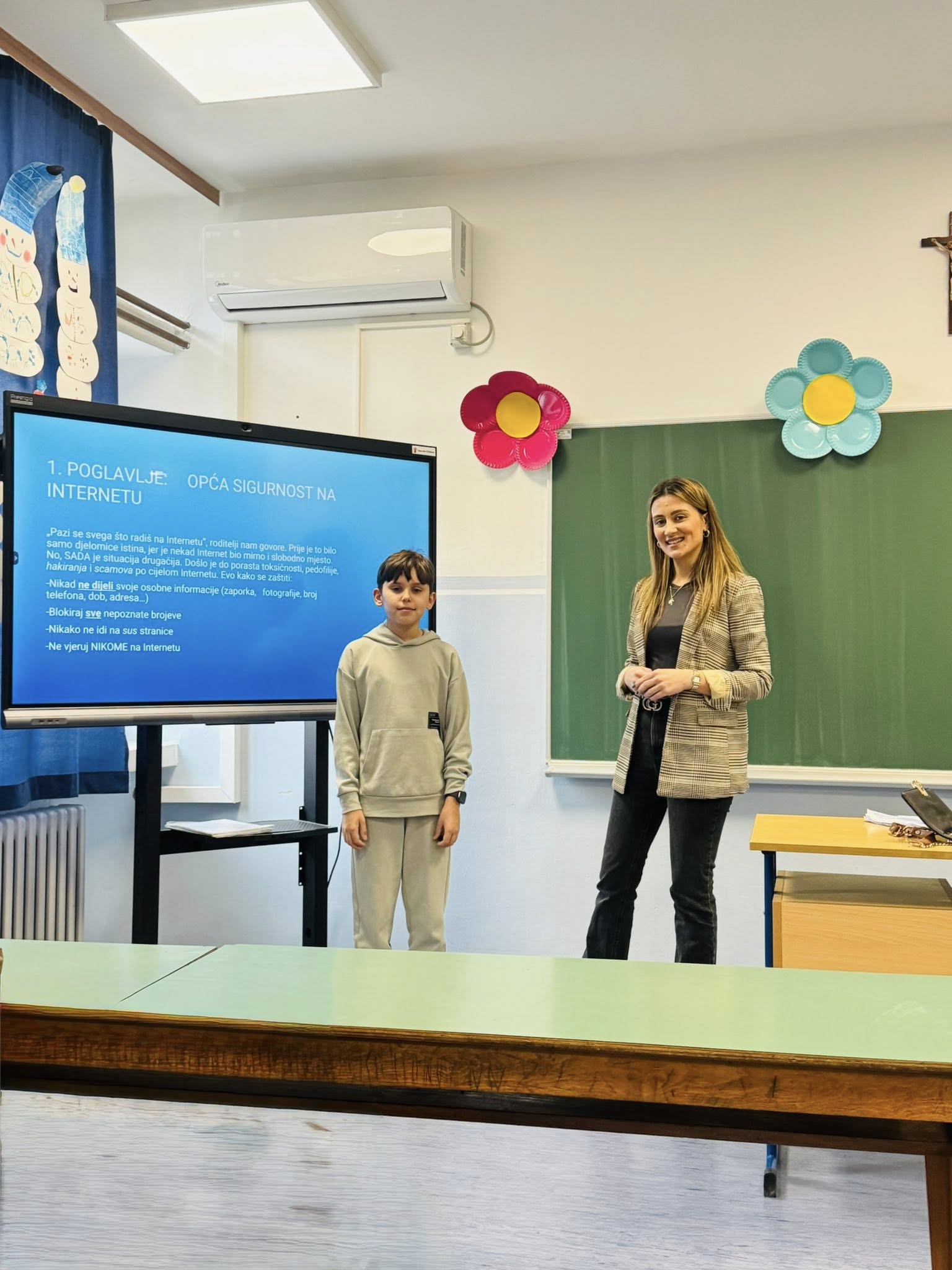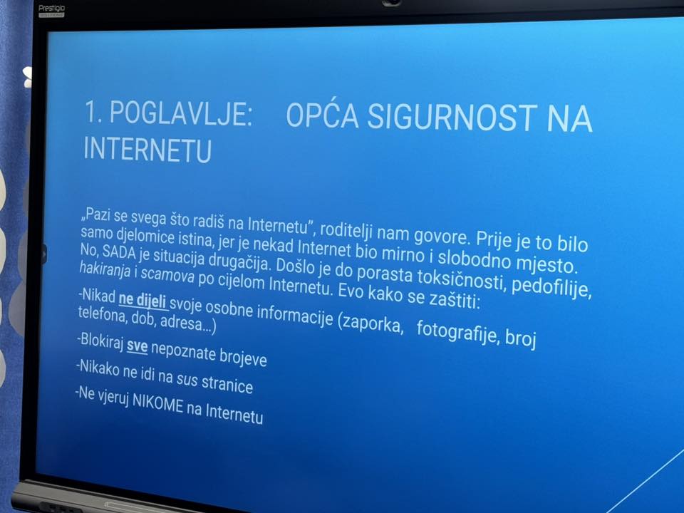 Tijekom radionice učenici su razgovarali o prednostima koje internet pruža u učenju, komunikaciji i svakodnevnom životu, ali i o mogućim opasnostima koje vrebaju u virtualnom svijetu. Posebna pozornost posvećena je zaštiti osobnih podataka, prepoznavanju neprimjerenih sadržaja, sigurnom korištenju društvenih mreža te važnosti prijavljivanja nasilja na internetu. Kroz primjere iz stvarnog života i interaktivnu raspravu učenici su imali priliku iznijeti svoja iskustva i postavljati pitanja.
