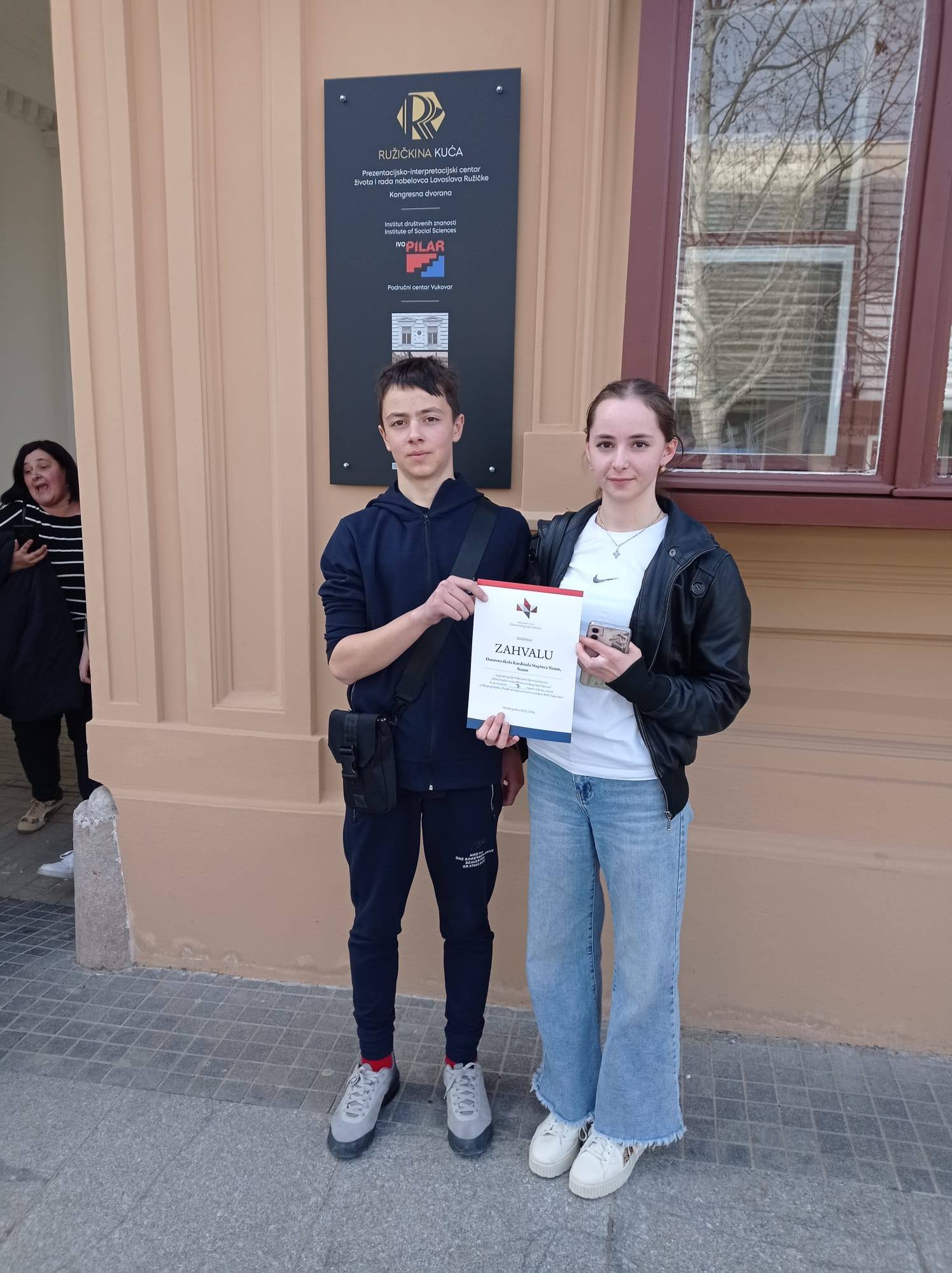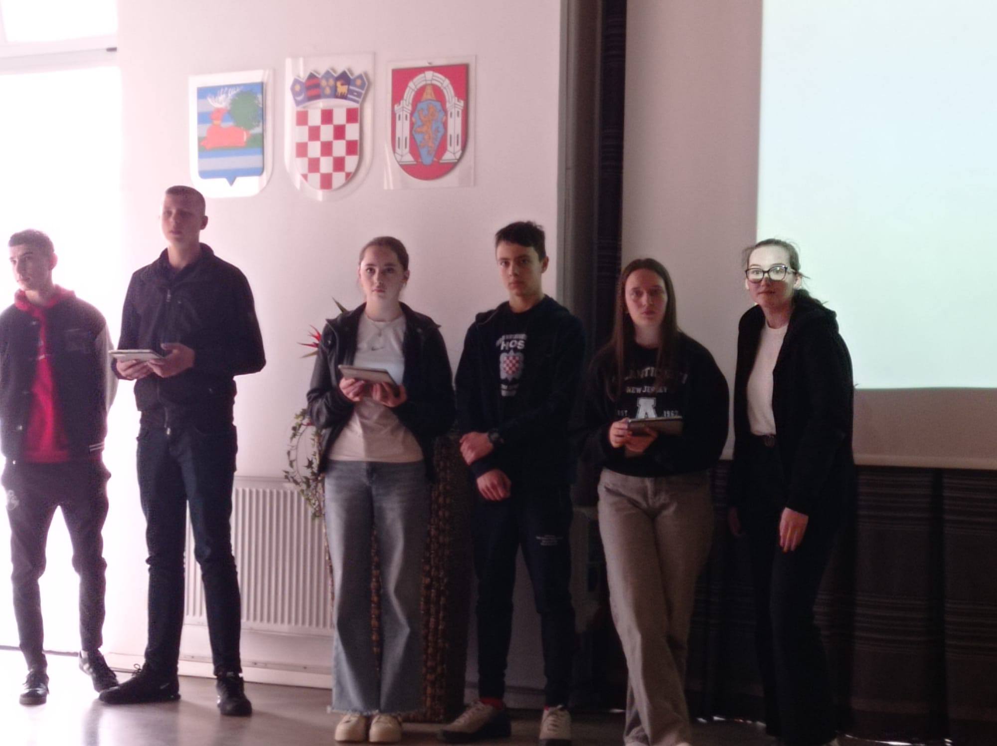 3.MJESTO NA KVIZU U VUKOVARU10.ožujka,zadnjeg dana boravka naših devetaša u Vukovaru,u sklopu projekta "Posjet učenika završnih razreda iz BIH Vukovaru",održan je kviz znanja u kojemu su IVA BOGDANOVIĆ i MIHAEL MIŠKOVIĆ, od ukupno 7 ekipa,osvojili 3.mjesto. Čestitke na osvojenoj bronci i pokazanom znanju!