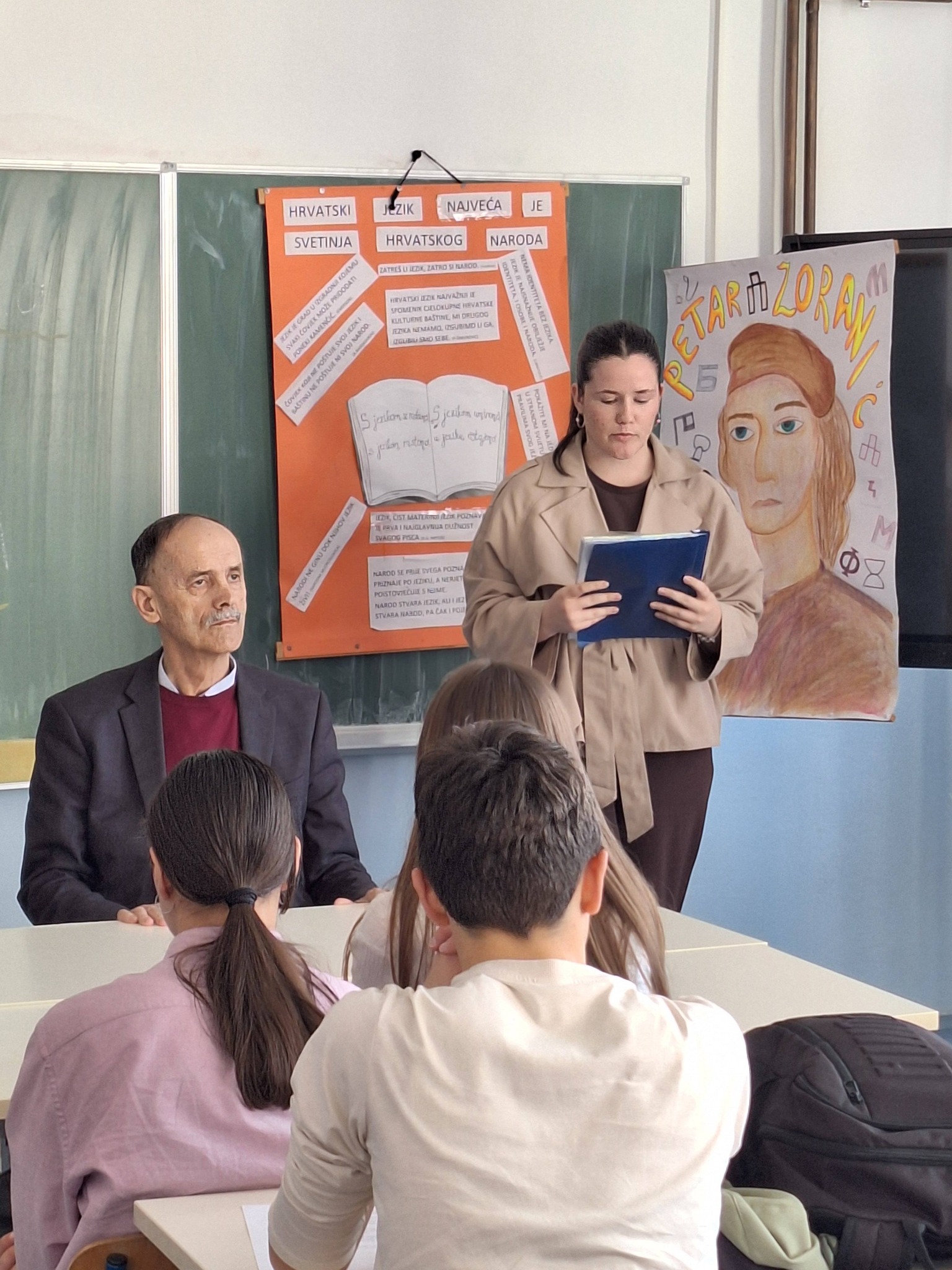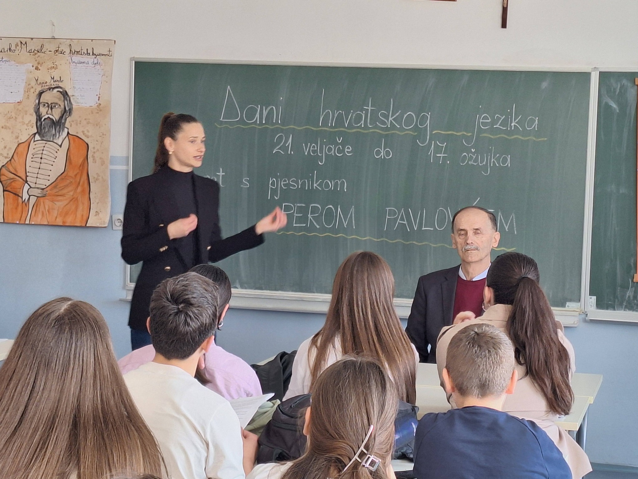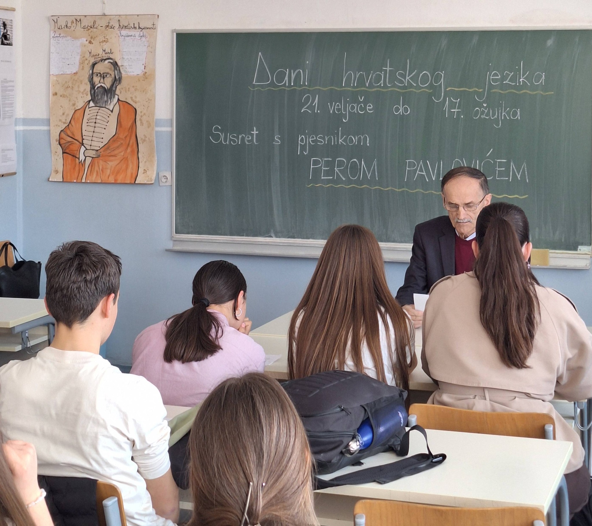 Nakon toga, naš gost, književnik Pero Pavlović, prestavio je dio svog književnog stvaralaštva ispričavši zanimljive priče o njegovom pisanju poezije koja za njega predstavlja istinsku slobodu i ljubav prema jeziku. Učenici su s velikim zanimanjem slušali njegove stihove i imali priliku razgovarati s književnikom, postavljajući razna pitanja o inspiraciji i načinu pisanja poezije.