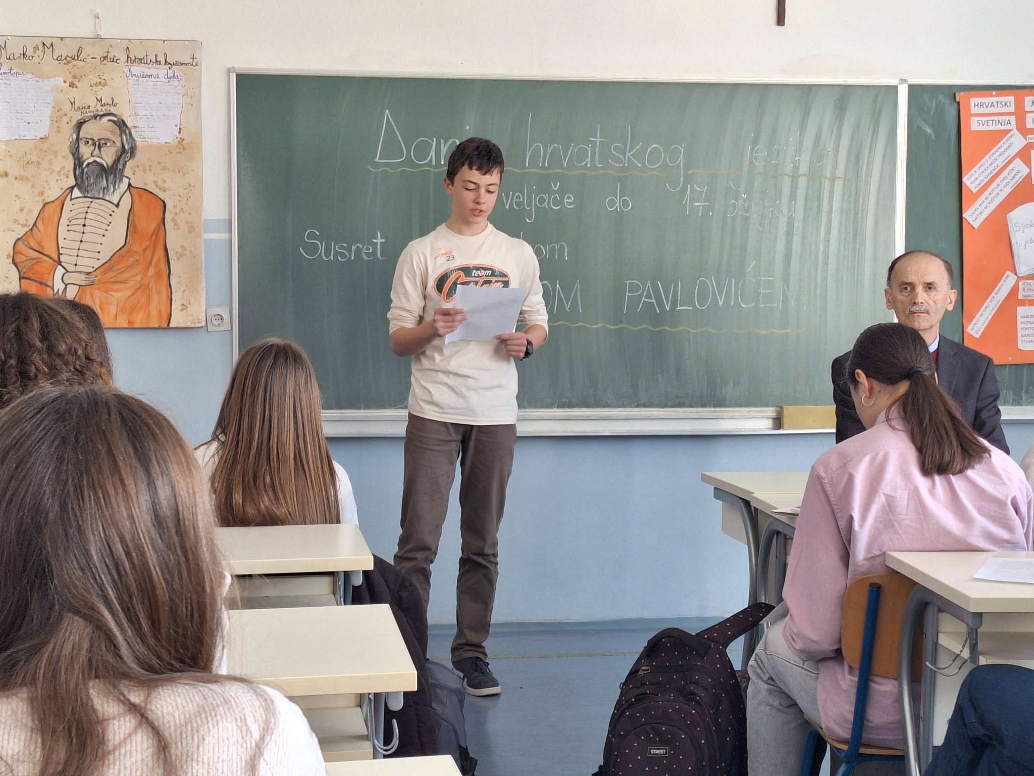 U našoj školi obilježili smo Dane hrvatskog jezika prigodnim programom u kojem je sudjelovao i književnik Pero Pavlović. Ovaj susret bio je lijepa prilika da se učenici još jednom podsjete važnosti materinskog jezika, njegove bogate tradicije i kulturne vrijednosti.