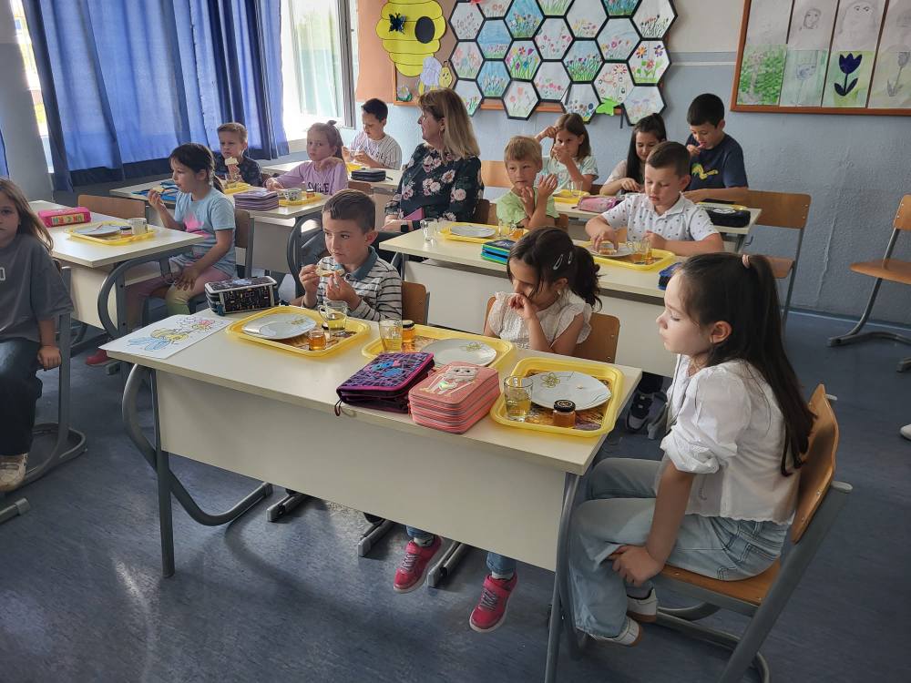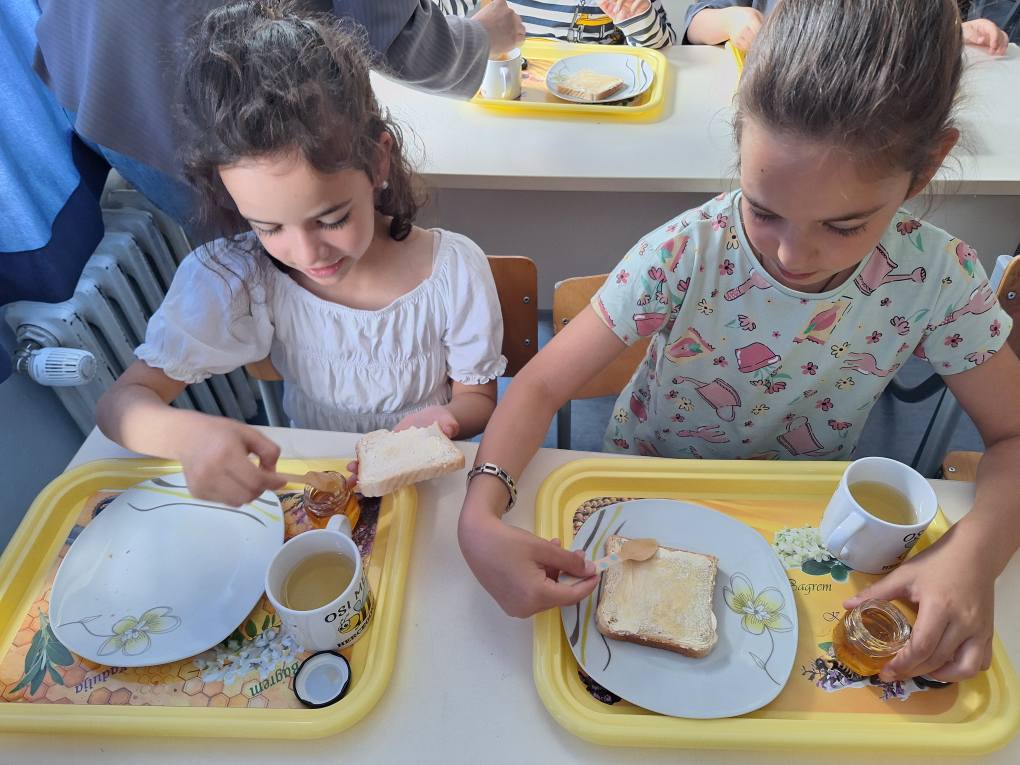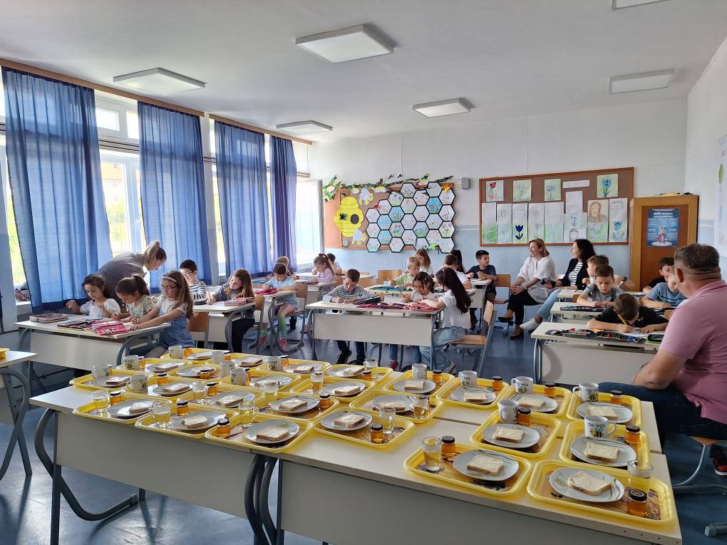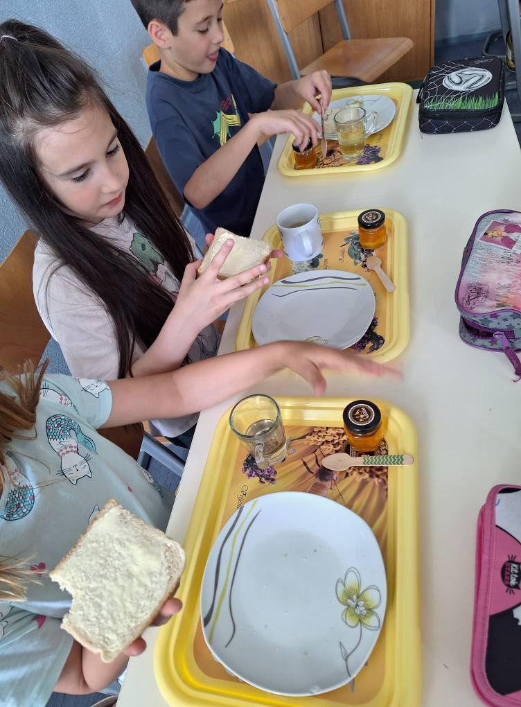 Najslađi je ipak bio završni dio Medenoga sata kada su učenici na tacnama s motivima pčele i medonosnih biljaka dobili posluženi kruh s maslacem, na koji su sami drvenim žličicama mazali med, i čaj koji su medom zasladili.